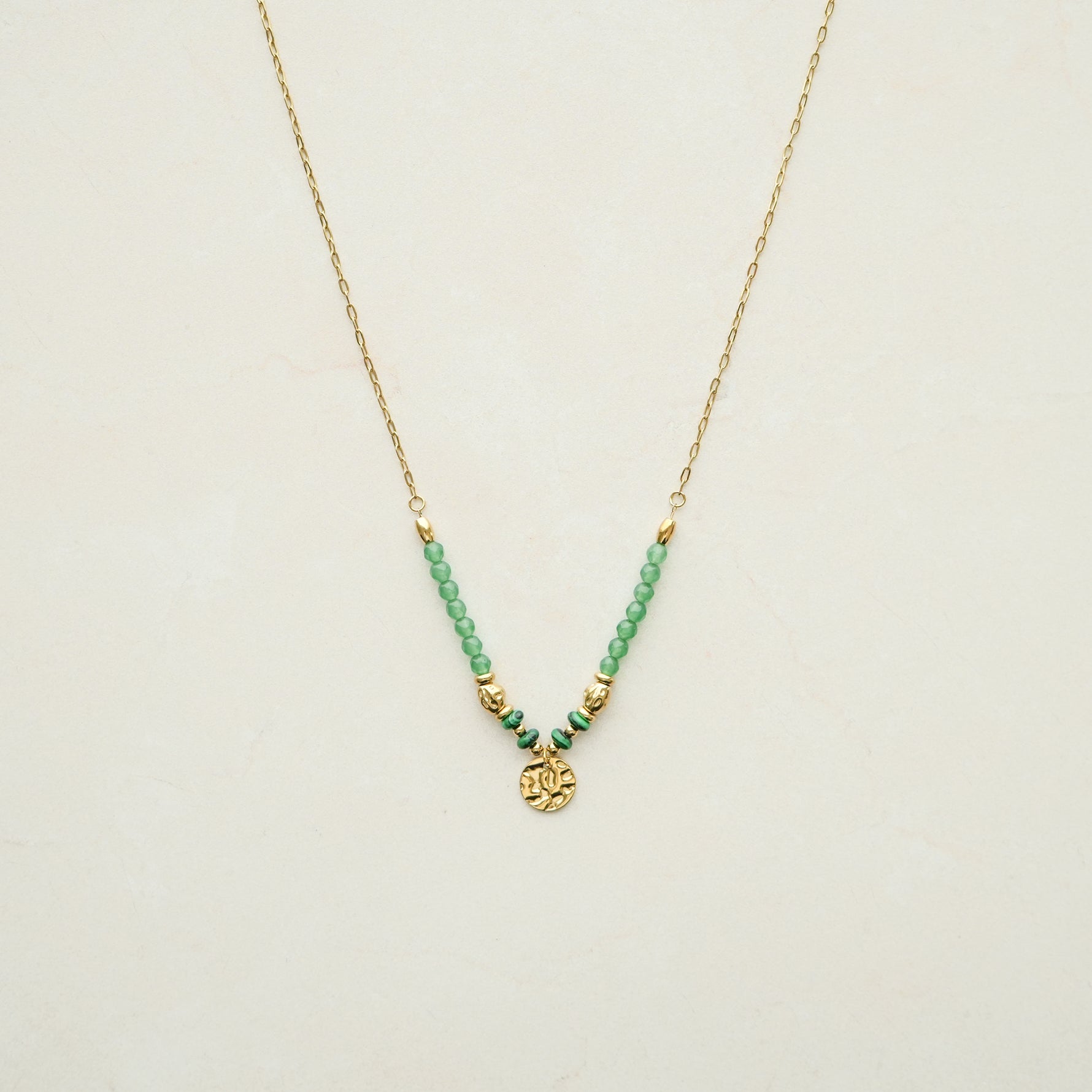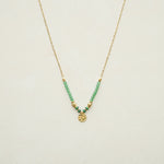 Emerald Cove necklace features a dainty chain accented with emerald-hued and gold beads for a delicate, refined finish.