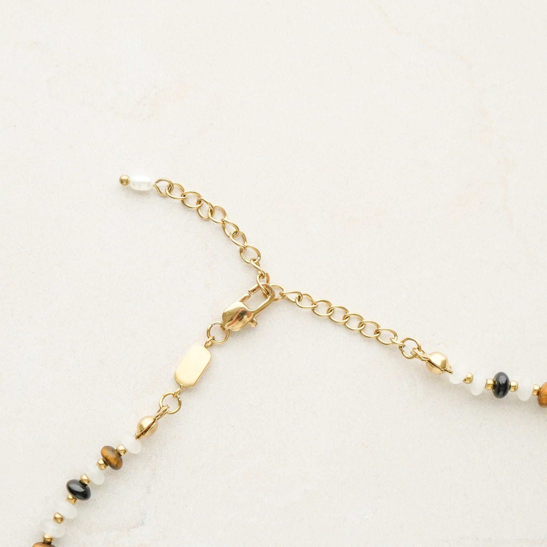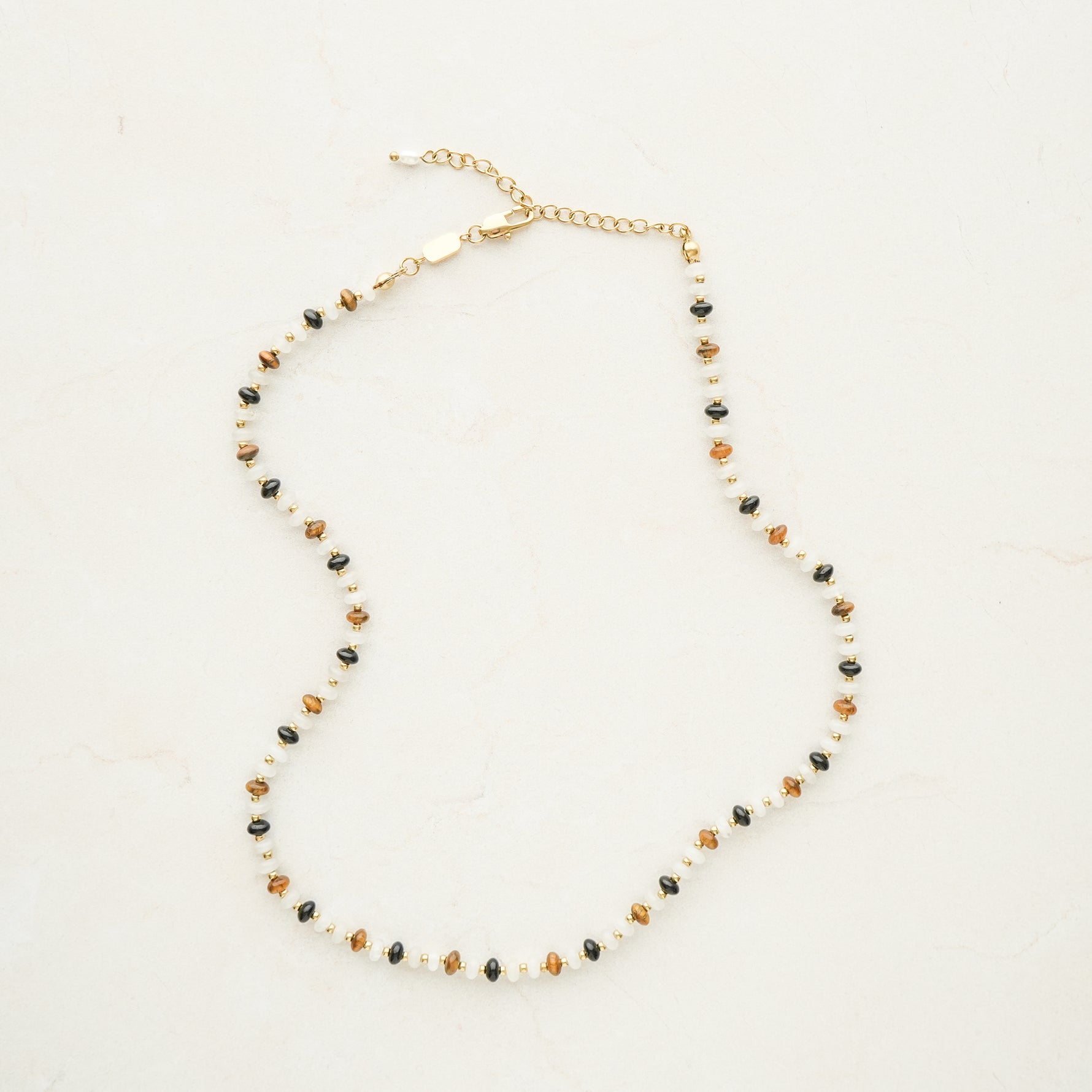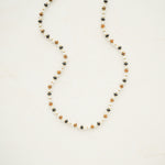 Bring warmth to any outfit with this necklace, featuring brown, clear, and delicate gold beads in a soft, versatile mix.