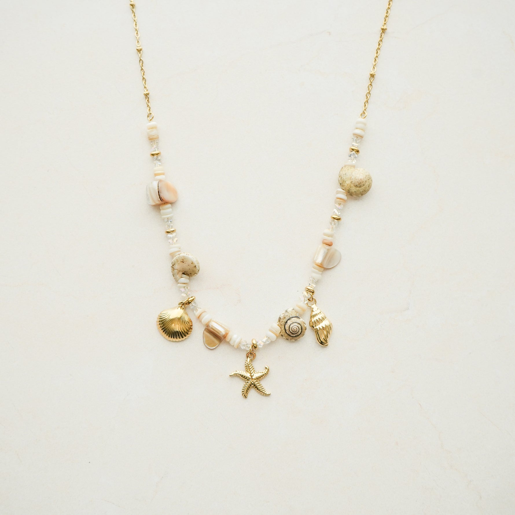 This beachy necklace mixes shells, beads, and charms for a fun, sun-soaked look perfect for everyday wear.
