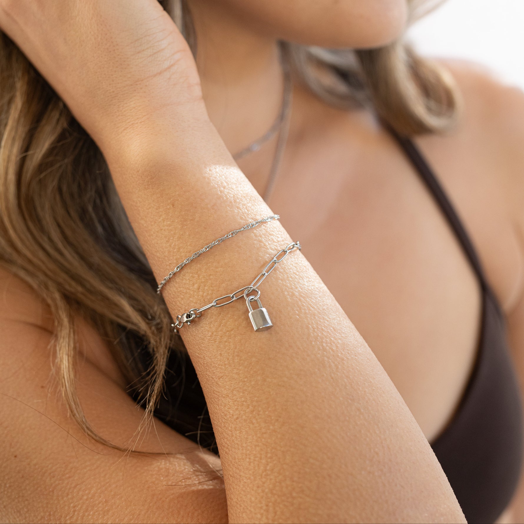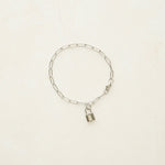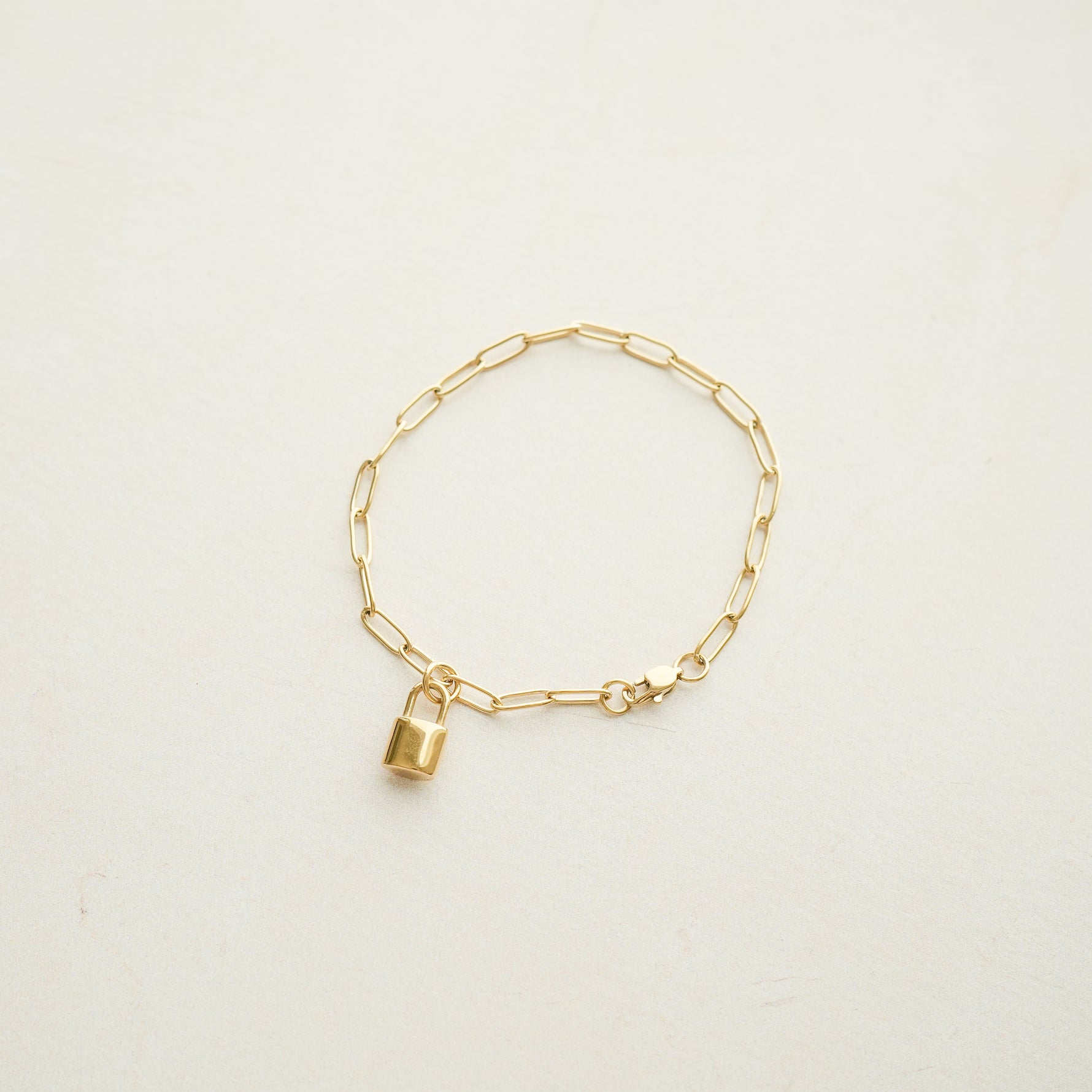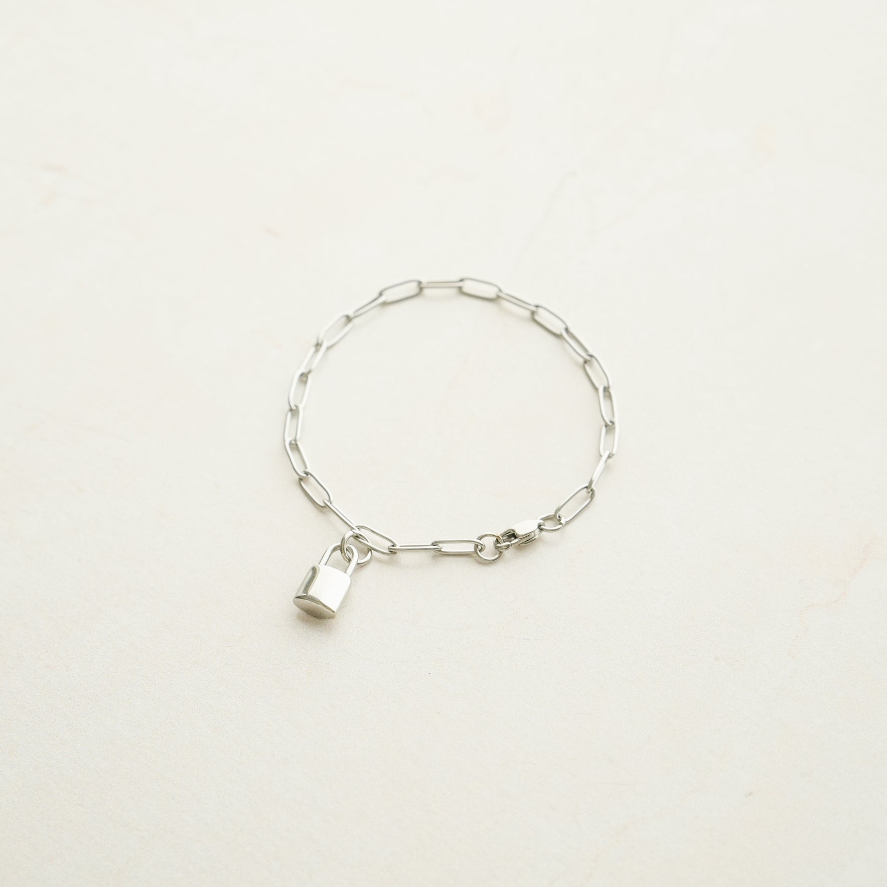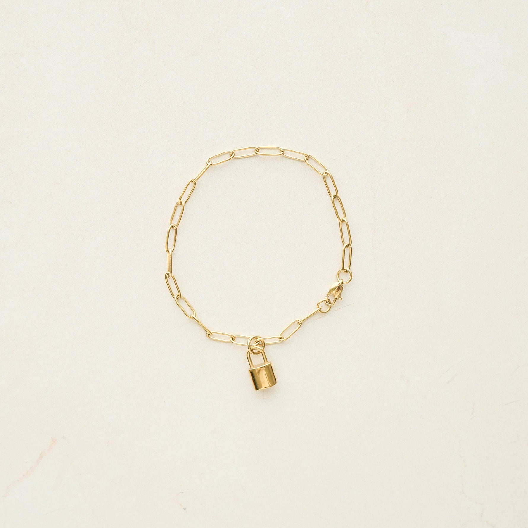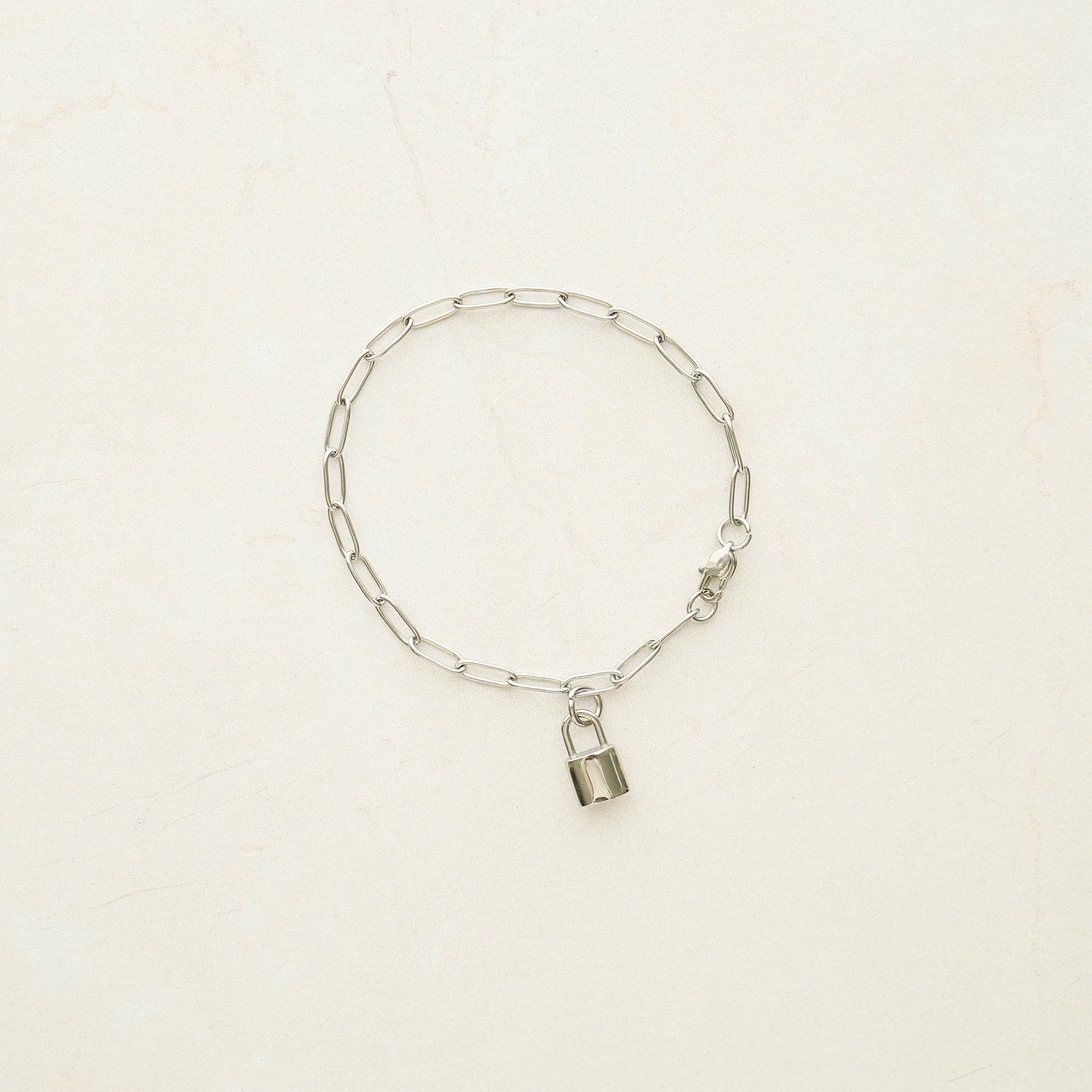 A minimalist piece with a bit of character. The paperclip chain and lock charm fit seamlessly into your everyday style.