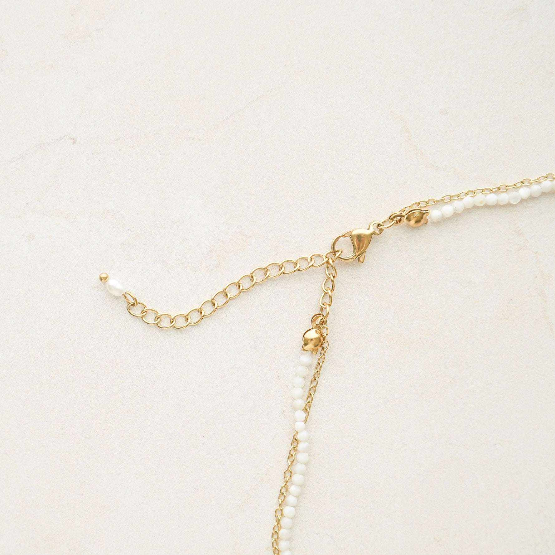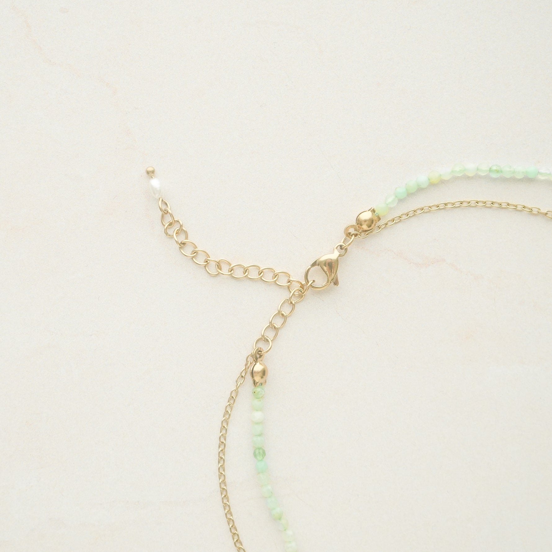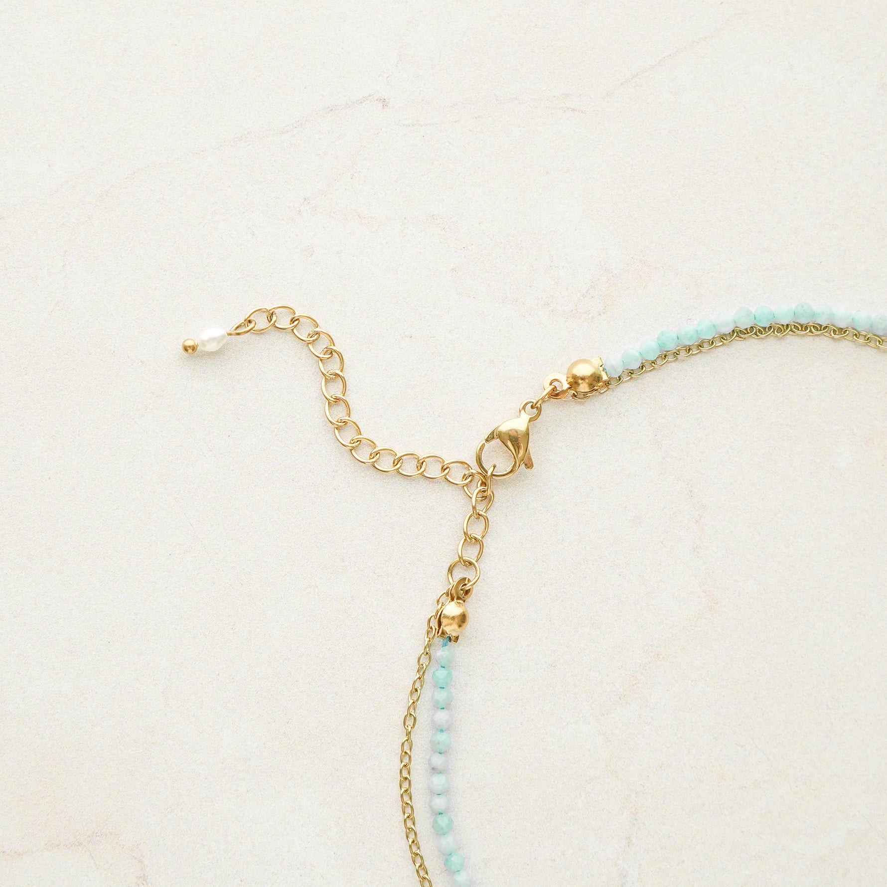 A double-layered design featuring a first layer of luminous beads — classic white, serene sky-blue, or soft seafoam green — paired with a delicate gold chain for a layered look.