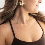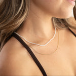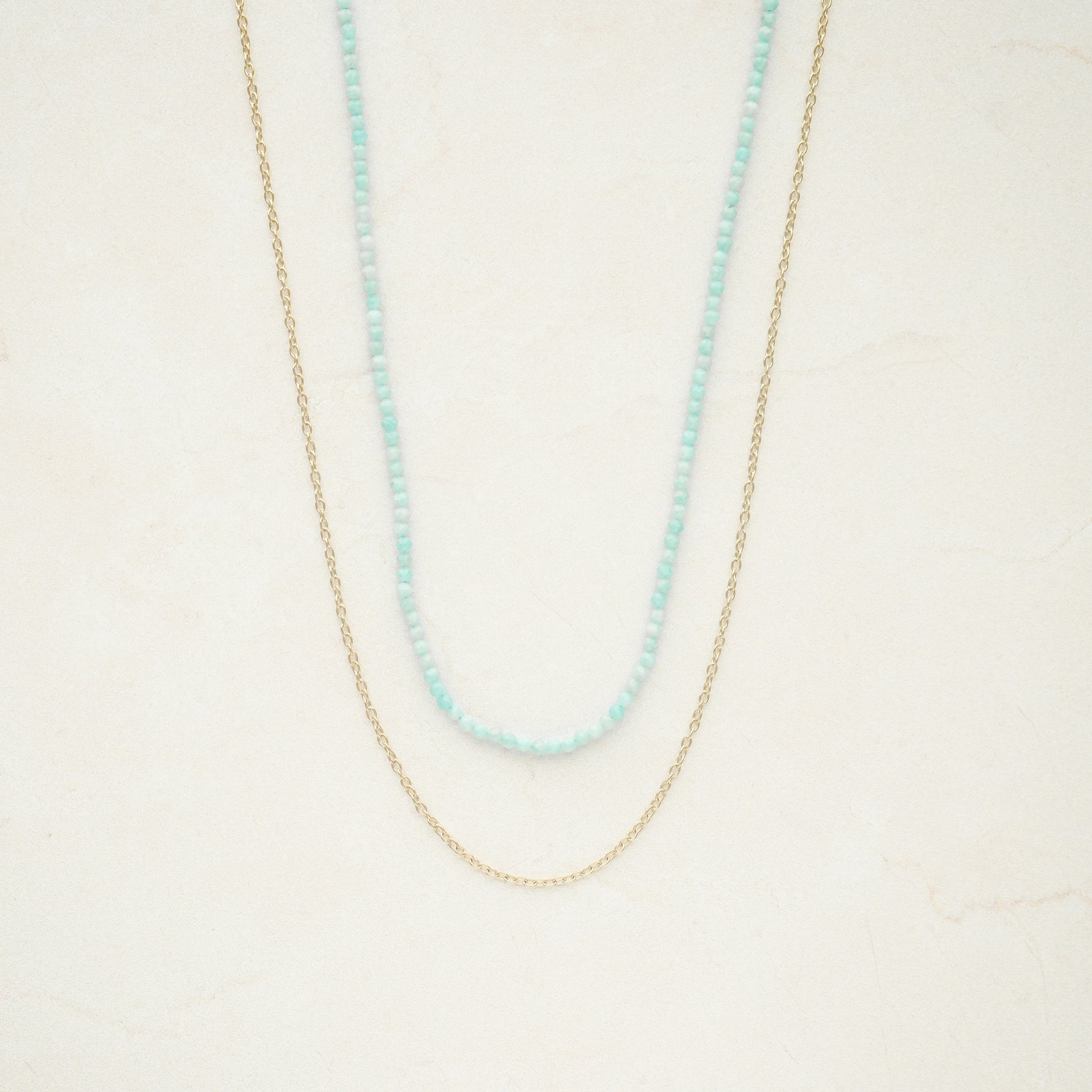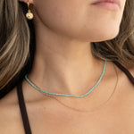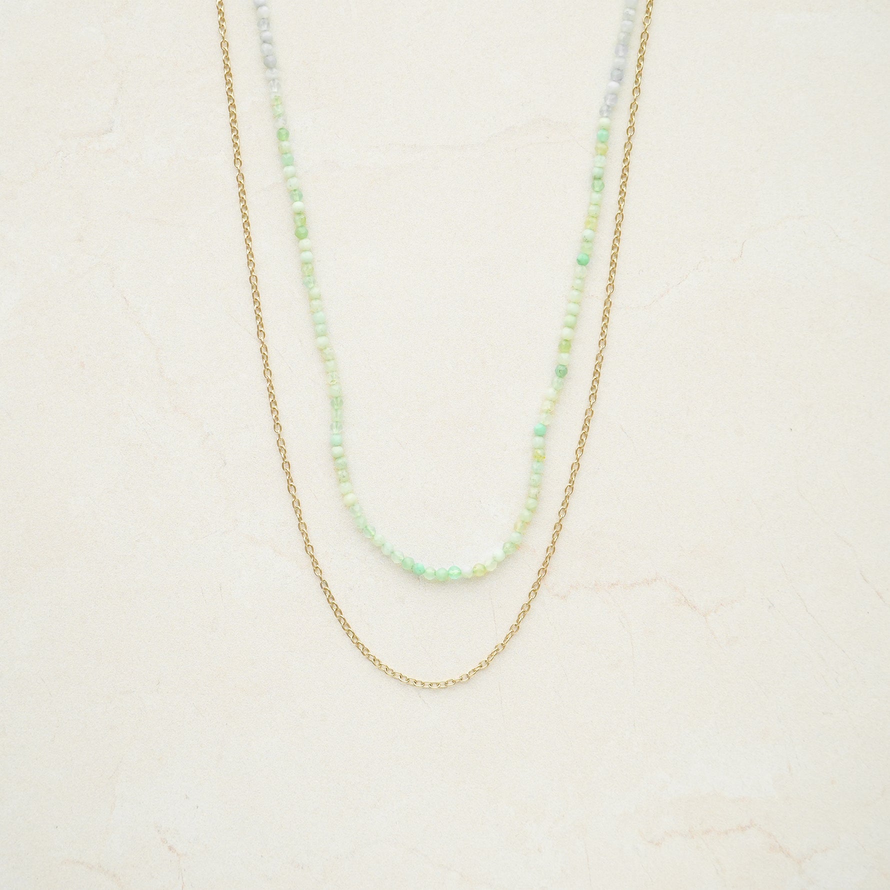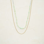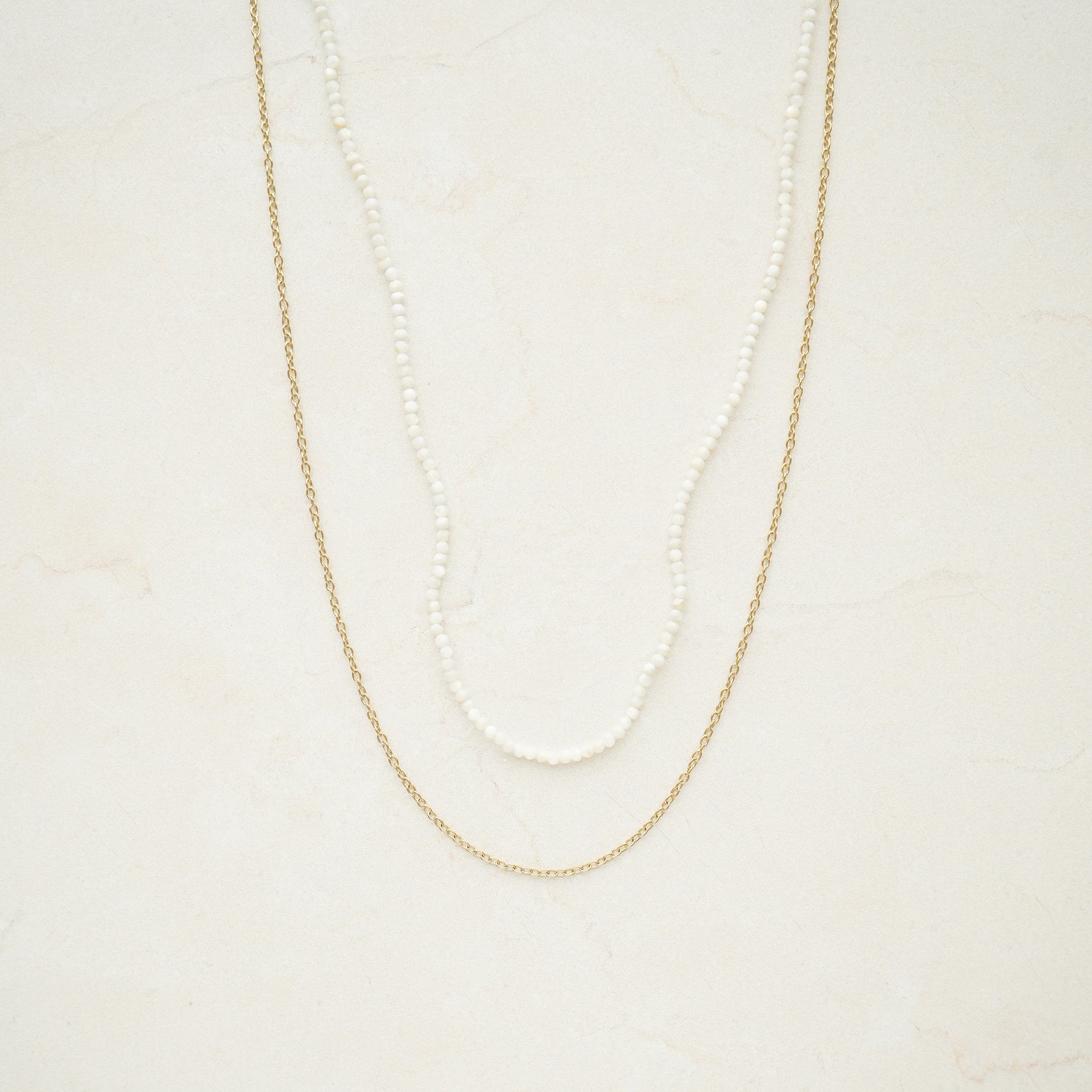 A double-layered design featuring a first layer of luminous beads — classic white, serene sky-blue, or soft seafoam green — paired with a delicate gold chain for a layered look.